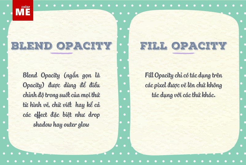 Trong khi Blend Opacity (hay ngắn gọn là Opacity) được dùng để điều chỉnh độ trong suốt của tất cả mọi thứ từ hình vẽ, chữ viết trên layer hay kể cả các effect đặc biệt như drop shadow hay outer glow thì Fill Opacity chỉ có tác dụng trên các pixel được vẽ lên chứ không tác dụng với các thứ khác.