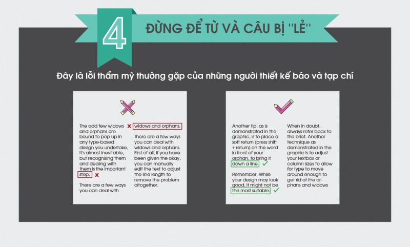 Từ bị ‘’lẻ loi’’là từ duy nhất ở trên 1 dòng. Còn câu bị ‘’lẻ loi’’ là câu thuộc một đoạn văn bản. Tuy nhiên lại bị đẩy sang cột tiếp theo. Đây là lỗi thẩm mỹ thường gặp của những người thiết kế báo và tạp chí, thường rất khó thấy nhưng nhận ra và giải quyết chúng là một bước rất quan trọng để biến tác phẩm của bạn từ nghiệp dư trở nên chuyên nghiệp hơn rất nhiều