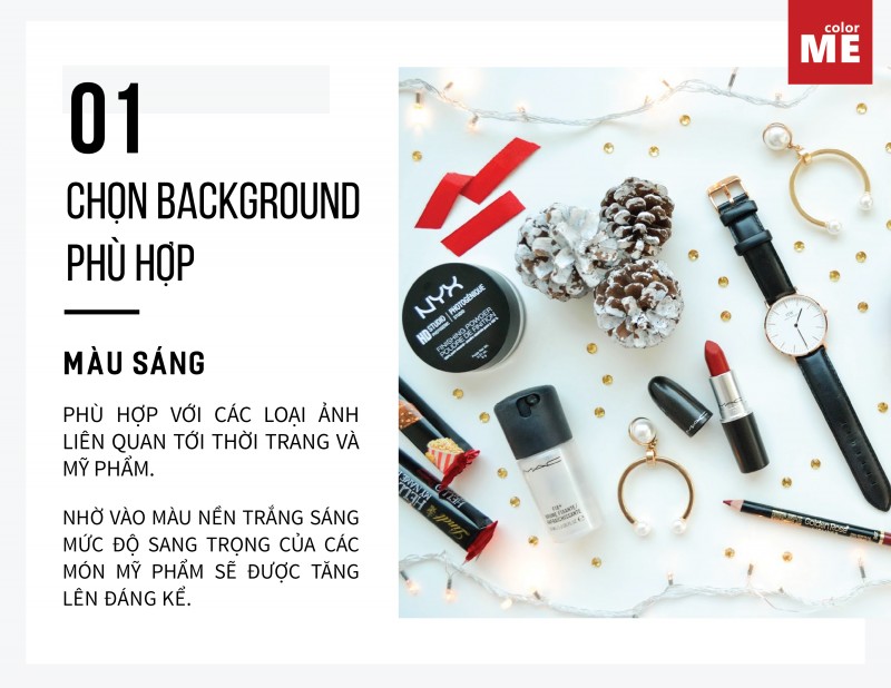 Màu sáng (trắng, các màu pastel,...): phù hợp nhất với các loại ảnh liên quan tới thời trang và mỹ phẩm. Nhờ vào màu nền trắng sáng, mức độ sang trọng của các món mỹ phẩm sẽ được tăng lên đáng kể. Bạn có thể lựa chọn dùng bất cứ mặt phẳng nào có màu trắng sáng chẳng hạn như một chiếc bàn trắng, giường có chăn ga màu trắng hay thậm chí là đầu tư lấy một tấm bìa to màu trắng.