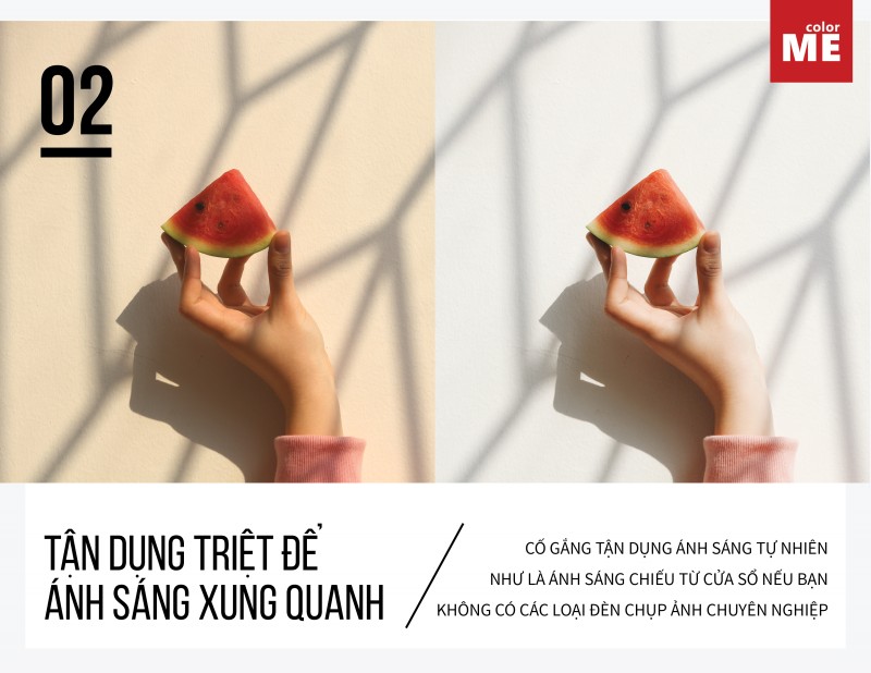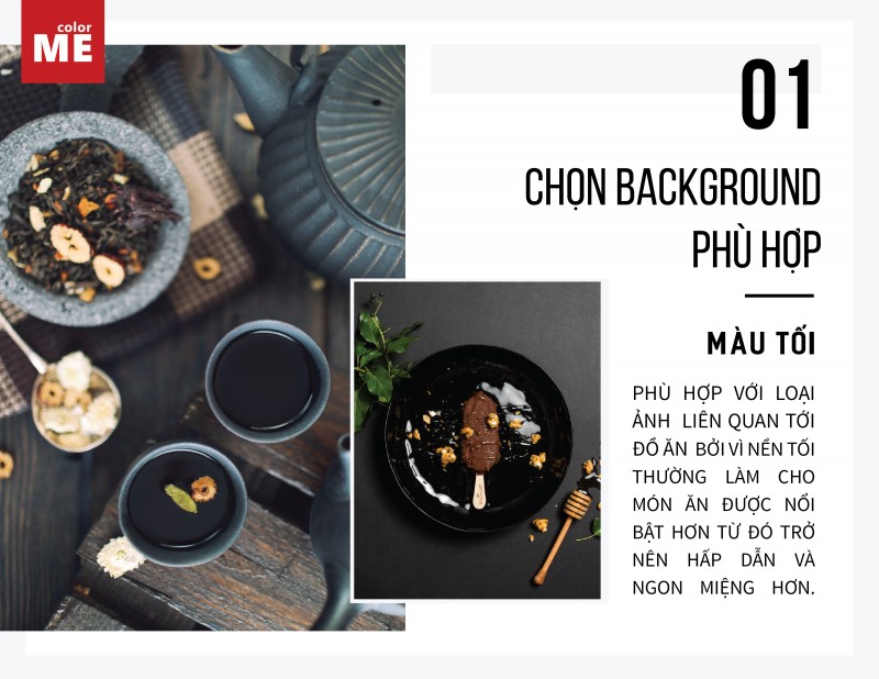 Màu tối (đen, xám, nâu,...): thường phù hợp với các loại ảnh liên quan tới đồ ăn bởi màu nền tối thường làm cho món ăn được nổi bật hơn từ đó trở nên hấp dẫn và ngon miệng hơn. Ở đây bạn có thể dùng mặt bàn gỗ, các loại bìa màu hoặc vải màu tối,...