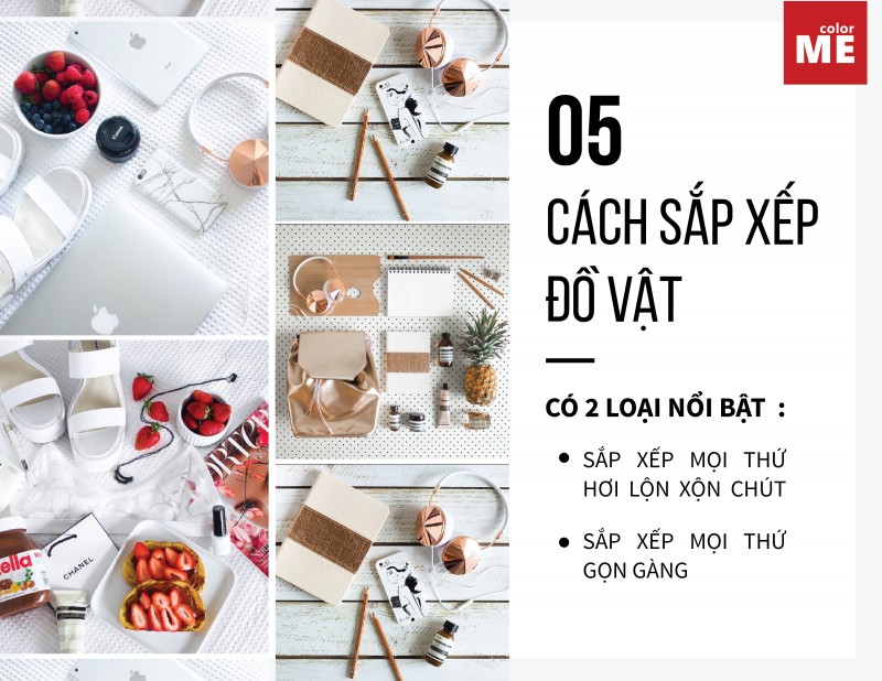 Đây là yếu tố quan trọng thể hiện phong cách riêng của bạn. Có 2 loại nổi bật là: sắp xếp mọi thứ vuông vắn, gọn gàng hoặc sắp xếp mọi thứ hơi lộn xộn chút. Mỗi phong cách đều có sự hấp dẫn của riêng nó và cũng đều tốn nhiều công sức tạo ra như nhau. Chẳng hạn khi bạn muốn thử chụp ảnh các món đồ lộn xộn chút thì bạn cũng cần phải suy nghĩ sắp xếp rất nhiều chứ không thể cứ thế bày bừa linh tinh ra là “lộn xộn” được. Còn đương nhiên nếu muốn đồ vật trong ảnh của mình được sắp xếp gọn gang thì bạn cũng sẽ phải tốn rất nhiều công sức sắp xếp rồi :">