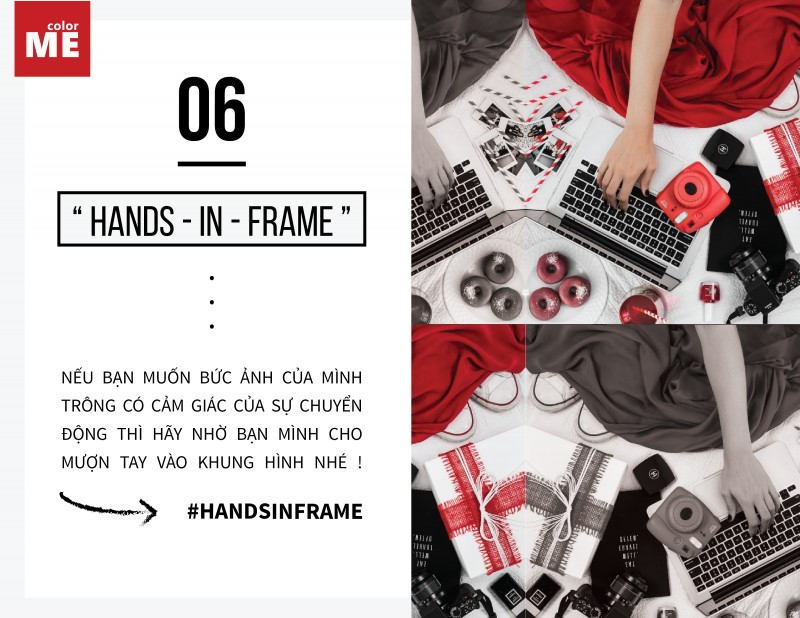 Đây là yếu tố tùy chọn. #HandsInFrame là một hashtag rất phổ biến trên Instagram thường xuất hiện ở các bức ảnh flatlay đẹp lung linh, ảo diệu. Nếu bạn hay ngắm nghía các bức ảnh flatlay trên mạng hẳn bạn sẽ để ý thấy rằng các photographer rất thích cho thêm bàn tay hay cánh tay vào bức ảnh của mình. Điều này đơn giản là nó sẽ giúp cho bức ảnh trông bớt “tĩnh lặng” hơn. Vì vậy nếu bạn muốn bức ảnh của mình trông có cảm giác của sự chuyển động thì hãy nhờ bạn mình cho mượn đôi tay vào khung hình nhé!