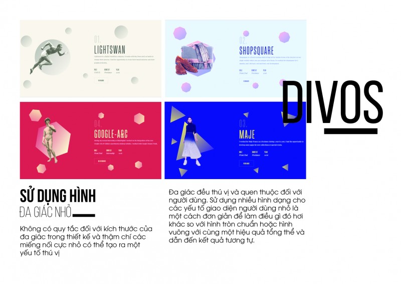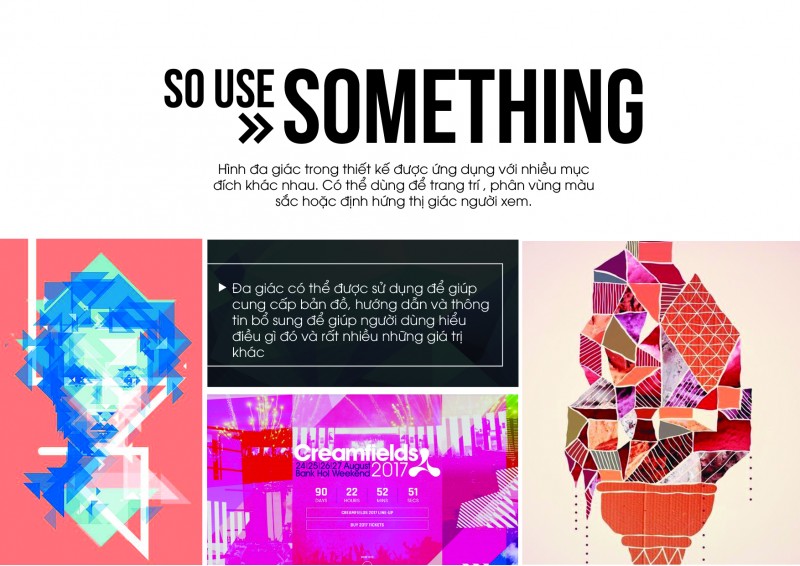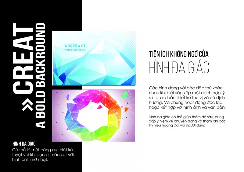 HÌNH ĐA GIÁC : Có thể là một công cụ thiết kế tuyệt vời khi bạn bị mắc kẹt với hình ảnh mờ nhạt.. Các hình dạng với các đặc thù khác nhau khi biết sắp xếp một cách hợp lý sẽ tạo ra bản thiết kế thú vị và có định hướng. Và chúng hoạt động độc lập hoặc kết hợp với hình ảnh và văn bản.