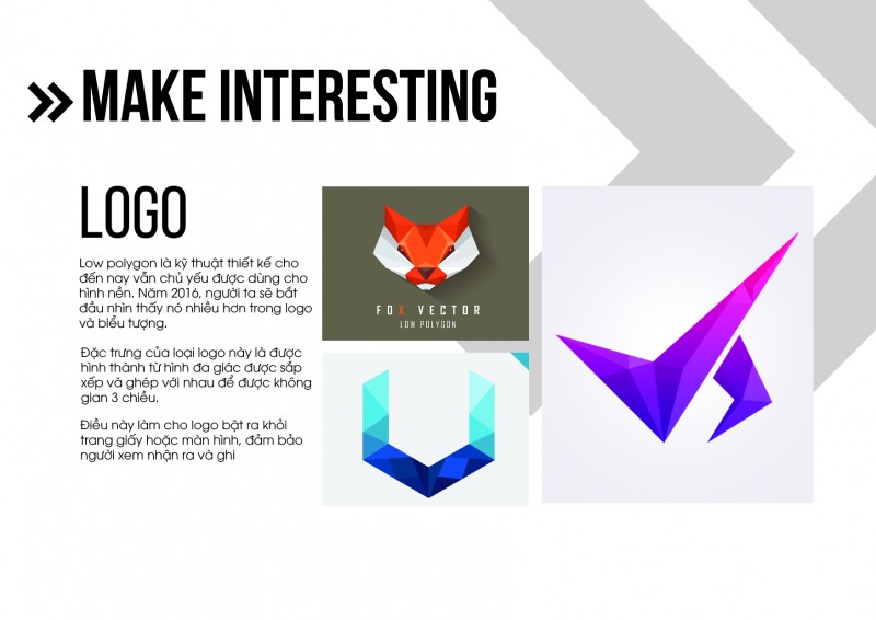 LOGO : Low polygon là kỹ thuật thiết kế cho đến nay vẫn chủ yếu được dùng cho hình nền. Năm 2016, người ta sẽ bắt đầu nhìn thấy nó nhiều hơn trong logo và biểu tượng. Đặc trưng của loại logo này là được hình thành từ hình đa giác được sắp xếp và ghép với nhau để được không gian 3 chiều. Điều này làm cho logo bật ra khỏi trang giấy hoặc màn hình, đảm bảo người xem nhận ra và ghi