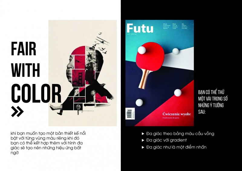 khi bạn muốn tạo một bản thiết kế nổi bật với từng vùng màu riêng khi đó bạn có thể kết hợp thêm với hình đa giác sẽ tạo nên những hiệu ứng bất ngờ