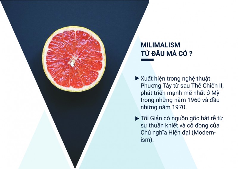 Tối Giản – Minimalism xuất hiện trong nghệ thuật Phương Tây từ sau Thế Chiến II, phát triển mạnh mẽ nhất ở Mỹ trong những năm 1960 và đầu những năm 1970. Tối Giản có nguồn gốc bắt rễ từ sự thuần khiết và cô đọng của Chủ nghĩa Hiện đại (Modernism). Xét trên phương diện rộng lớn hơn, người ta tìm thấy nguồn gốc của Phong cách Tối giản Châu Âu trong các concept hình học trừu tượng của các họa sĩ theo phong trào nghệ thuật Bauhaus và De Stijl mà đi đầu là những tác phẩm của Kazimir Malevich, Piet Mondrian; các nghệ sĩ khác trong phong trào Kết cấu Nga…