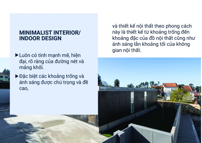 Nội thất Tối Giản (Minimalist Interior/Indoor Design) luôn có tính mạnh mẽ, hiện đại, rõ ràng của đường nét và mảng khối. Đặc biệt các khoảng trống và ánh sáng được chú trọng và đề cao, và thiết kế nội thất theo phong cách này là thiết kế từ khoảng trống đến khoảng đặc của đồ nội thất cũng như ánh sáng lẫn khoảng tối của không gian nội thất.