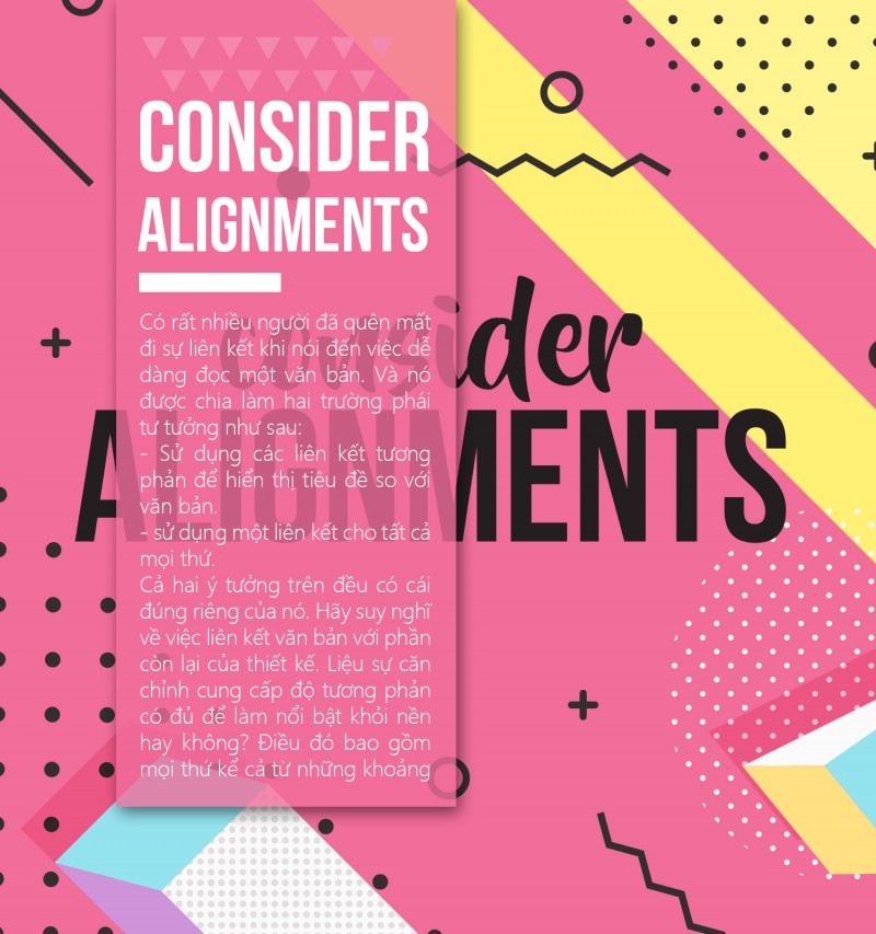 Cả hai ý tưởng trên đều có cái đúng riêng của nó. Hãy suy nghĩ về việc liên kết văn bản với phần còn lại của thiết kế. Liệu sự căn chỉnh cung cấp độ tương phản có đủ để làm nổi bật khỏi nền hay không? Điều đó bao gồm mọi thứ kể cả từ những khoảng cách hay những yếu tố nhỏ nhất trong các mối quan hệ với các yếu tố khác.
