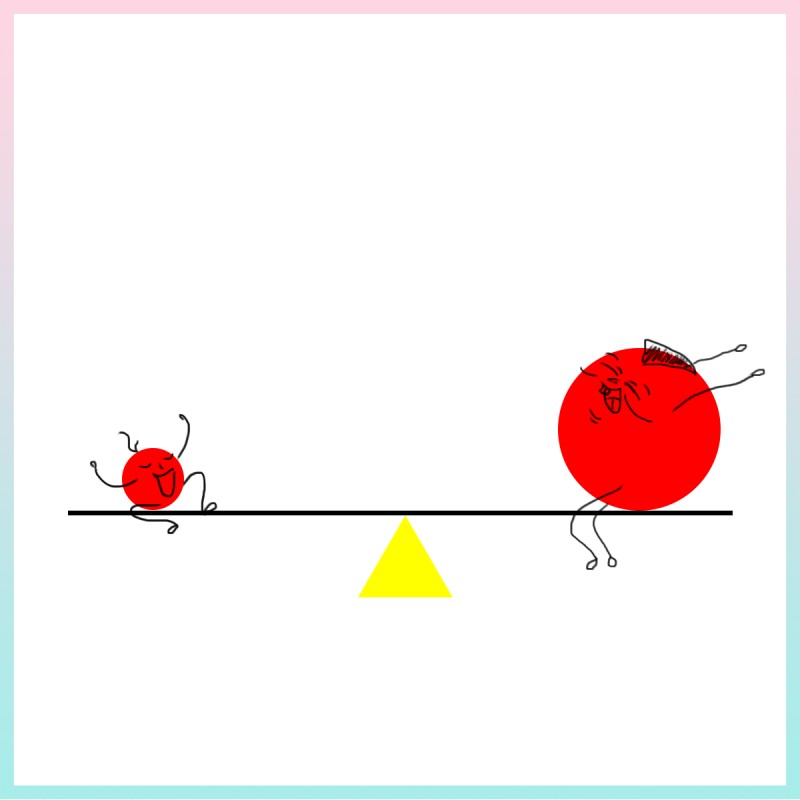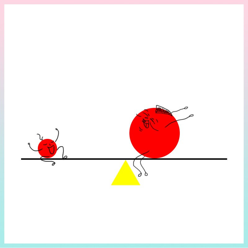 Hãy quan sát kỹ bức tranh vừa rồi, mặc dù chiếc bập bênh vẫn nằm ở vị trí cân bằng, tuy nhiên ta vẫn có cảm giác gì đó không cân xứng ở đây? Chúng ta đều biết chắc chắn rằng khi cậu bé thịt lợn ngồi lên chiếc bập bênh, ngay lập tức nó sẽ nghiêng về phía cậu bé đó và ghế bên phải sẽ chạm xuống mặt đất.
