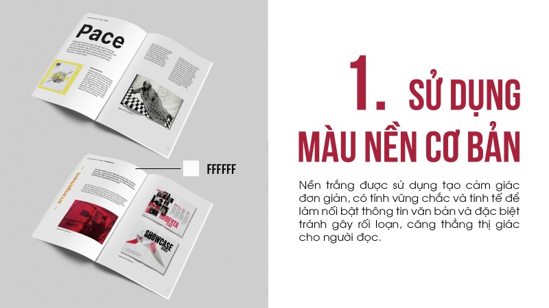 Nếu bạn lướt những trang tạp chí thì hơn 90% các trang đó trình bày nội dung luôn sử dụng trên nền trắng cơ bản. Và đây cũng là lý do tại sao trong ngành công nghiệp in ấn lại sử dụng nền trắng để ấn hành báo chí. Nền trắng được sử dụng tạo cảm giác đơn giản, có tính vững chắc và tinh tế để làm nối bật thông tin văn bản và đặc biệt tránh gây rối loạn, căng thẳng thị giác cho người đọc. Trong một số trường hợp, bạn có thể thấy những văn bản được in lên hay chèn trên hình ảnh. Bạn có thể dễ dàng nhận ra rằng việc sử dụng hợp lý kích thước văn bản trên hình ảnh sẽ thu hút sự quan tâm của người xem hơn, đồng thời cũng đảm bảo hiệu quả của tính tương phản giữa hình ảnh và văn bản. Rất ít khi bạn thấy việc sử dụng chữ viết chiếm tỷ lệ cao hơn hình ảnh trên một hình ảnh. Điều đó được coi là một nguyên tắc cơ bản trong thiết kế báo chí.