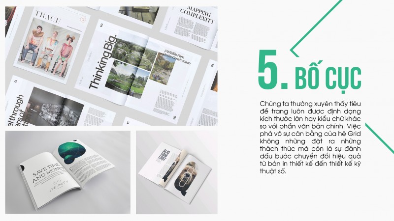Các trang báo chí sắp xếp và phân loại những hạng mục khá chặt chẽ. Tuy nhiên vì thế bất kỳ sự phá cách hay làm lệch hướng so với tiêu chuẩn thiết kế sẽ tạo ra sự quan tâm đặc biệt. Chính vì lý do đó, chúng ta thường xuyên thấy tiêu đề trang luôn được định dạng kích thước lớn hay kiểu chữ khác so với phần văn bản chính. Việc phá vỡ sự cân bằng của hệ Grid không những đặt ra những thách thức mà còn là sự đánh dấu bước chuyển đổi hiệu quả từ bản in thiết kế đến thiết kế kỹ thuật số.