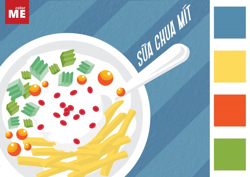 Sữa chua mít là một trong những món tráng miệng quá là nổi tiếng luôn rồi nhỉ? :D Món ăn gồm những sợi mít vàng bắt mắt, những miếng thạch xanh lá mát rượi kèm với đó là những viên thạch tròn cam cam, tất cả được đặt lên trên một lớp sữa chua trắng mịn màng đem đến người thưởng thức bao cảm xúc xao xuyến. Cùng với đó là chiếc bàn nhựa xanh biển huyền thoại ta thường thấy ở các quán ăn vặt vỉa hè. Nhìn tổng thể tất cả tạo nên palette gồm 4 màu Xanh biển – Vàng – Cam – Xanh lá mang đậm dư vị của mùa hè nhỉ.