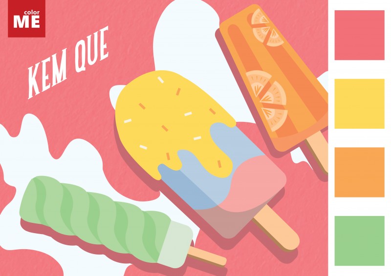 Nóng oi bức thế này mà không có kem để giải nhiệt thì làm sao bây giờ? ;_; Kem thì quá là nhiều loại rồi nhưng nào có ai không biết tới chiếc kem xoắn ốc bạc hà chanh màu xanh mát mẻ đâu. Hay là chiếc kem cam mà chúng mình từng rất thích ăn hồi nhỏ. Nào là vị vani màu vàng ngọt ngào và nào là vị dâu tây màu hồng xinh xắn. Tất cả tạo nên palette màu: Hồng – Vàng – Cam – Xanh lá cũng là một lựa chọn thú vị đấy chứ :D